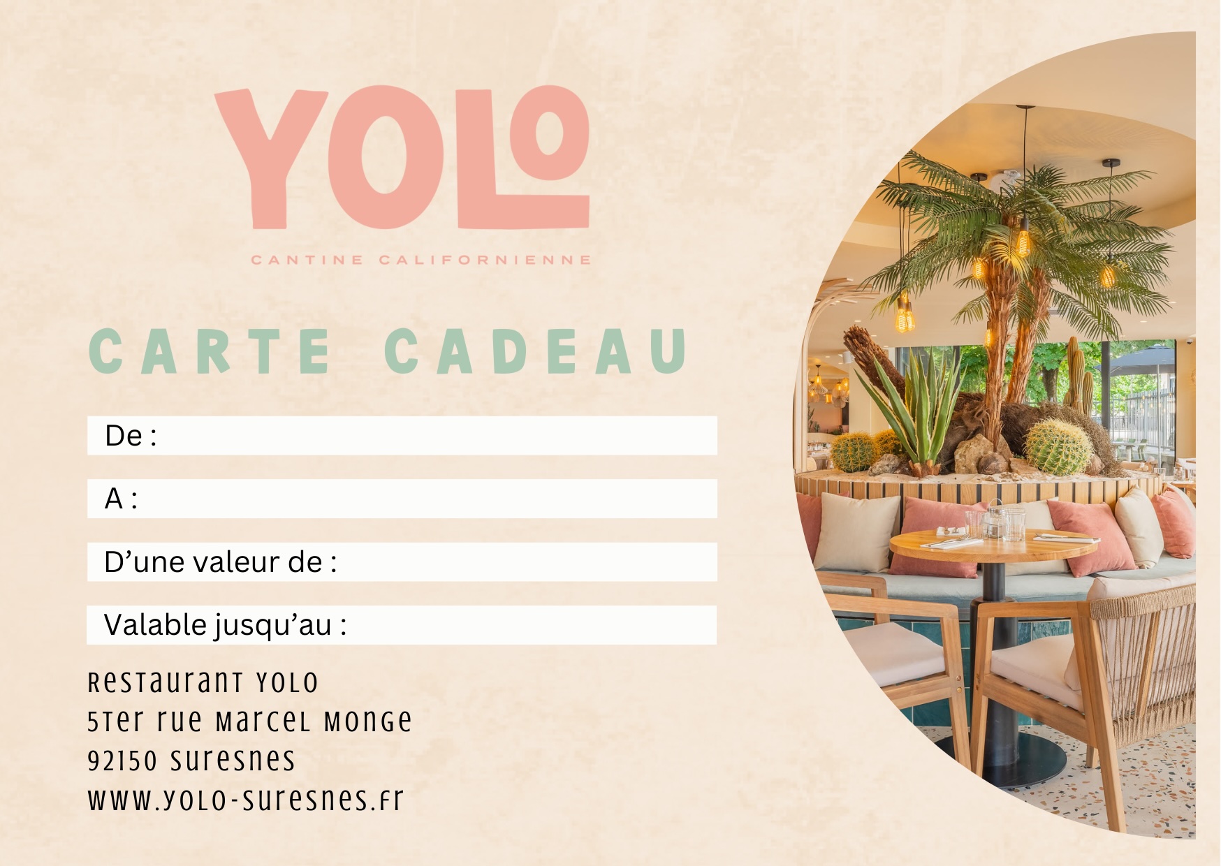 Toutes les occasions sont bonnes pour offrir à vos proches un voyage culinaire unique au YOLO Suresnes : cuisine fraiche et colorée, plats faits-maison, brunch délicieux, cocktails originaux et ambiance chaleureuse et ensoleillée. Une idée cadeau originale, garantie 100% plaisir en Ile de France.